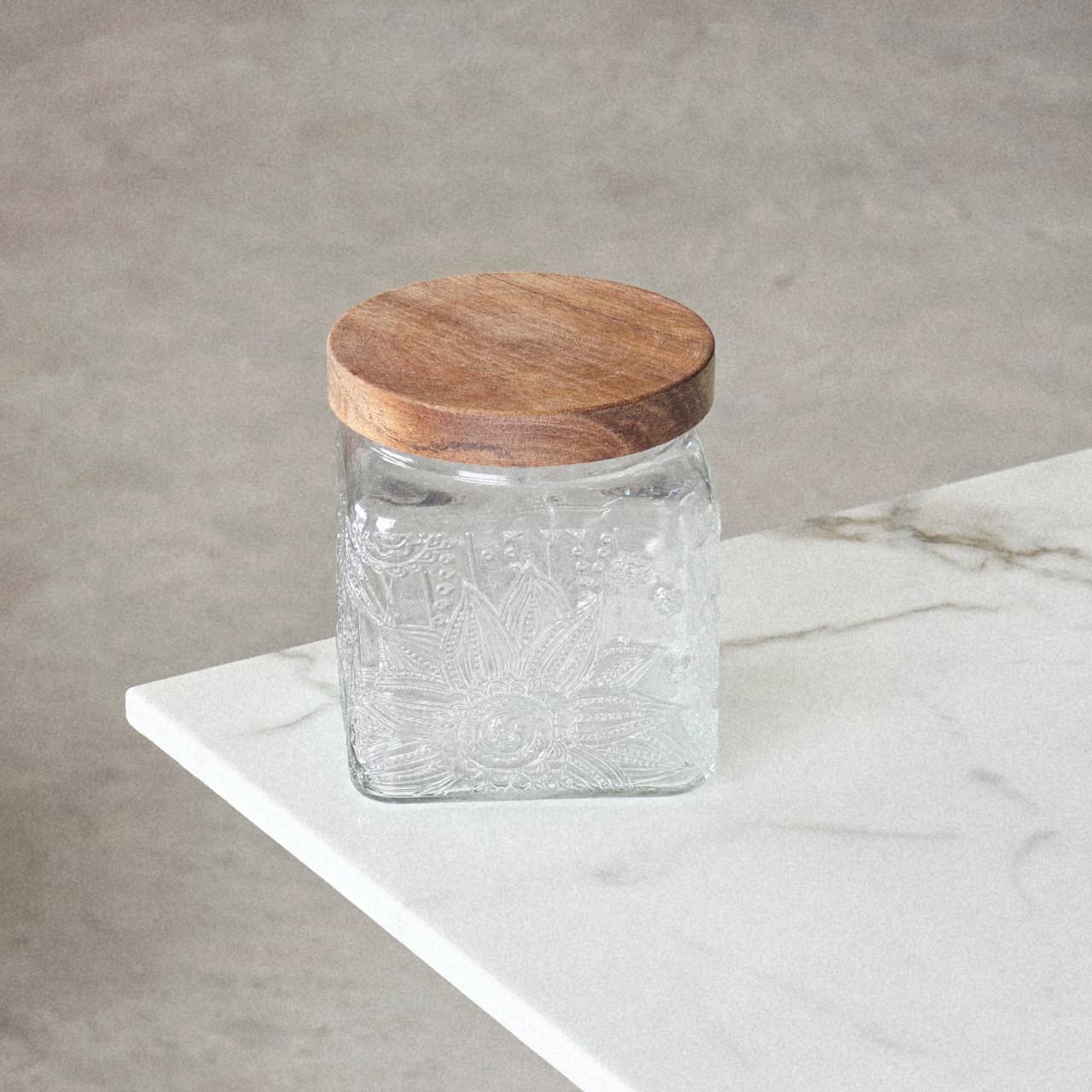 FRASCO DE VIDRIO LABRADO CON TAPA DE MADERA 700ML (MA 10-23)